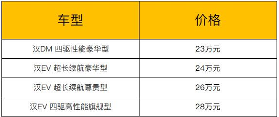 日前,從比亞迪官方獲得了比亞迪漢全系車型配置信息。比亞迪漢共推出了3款EV車型和1款PHEV車型,預(yù)售價區(qū)間為23.00萬-28.00萬元,新車將于6月上市。