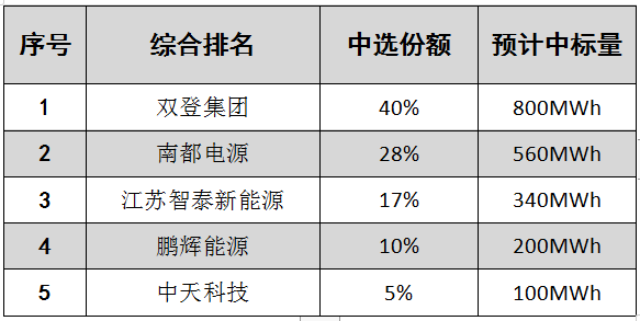 根據(jù)招標,本次采購周期為1年,采購規(guī)模的預(yù)估量為2.0GWh。招標產(chǎn)品型號分為20Ah、50Ah、100Ah、150Ah、200Ah五大類。項目不劃分標段,采用份額招標,中標人數(shù)量為5家。具體中標份額分配如下: