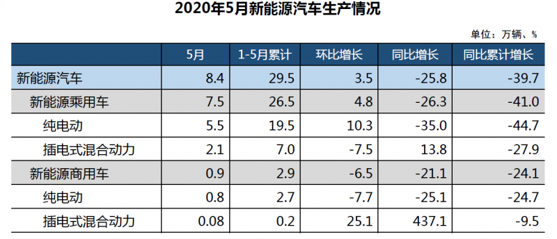 5月,新能源汽車產(chǎn)銷分別完成8.4萬輛和8.2萬輛,環(huán)比增長3.5%和12.2%,同比下降25.8%和23.5%。在新能源汽車主要品種中,與上月相比,純電動(dòng)汽車產(chǎn)銷均呈增長,插電式混合動(dòng)力汽車有所下降;與上年同期相比,插電式混合動(dòng)力汽車產(chǎn)量增長依然明顯,銷量下降較快,純電動(dòng)汽車產(chǎn)銷降幅仍然高于行業(yè)。