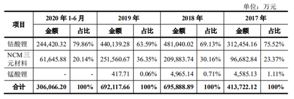 廈鎢新能主營業(yè)務(wù)為鋰離子電池正極材料的研發(fā)、生產(chǎn)和銷售,報告期內(nèi)主要產(chǎn)品為鈷酸鋰、鎳鈷錳三元材料等。主營業(yè)務(wù)收入按產(chǎn)品分類情況如下: