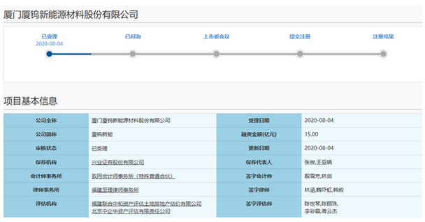 8月4日,上交所受理了廈門廈鎢新能源材料股份有限公司(“廈鎢新能”)的科創(chuàng)板IPO申請。