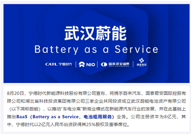 日前,寧德時(shí)代新能源科技股份有限公司(以下簡(jiǎn)稱寧德時(shí)代)宣布,與蔚來汽車、國(guó)泰君安國(guó)際控股有限公司和湖北省科技投資集團(tuán)有限公司三家企業(yè)共同投資成立武漢蔚能電池資產(chǎn)有限公司(以下簡(jiǎn)稱武漢蔚能)。