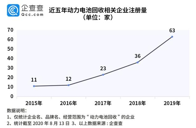 企查查數據顯示,我國共有208家動力電池回收相關企業(yè)。近幾年相關企業(yè)注冊量開始上升,2019年相關企業(yè)注冊量達到63家,較2018年同比上升了75%。