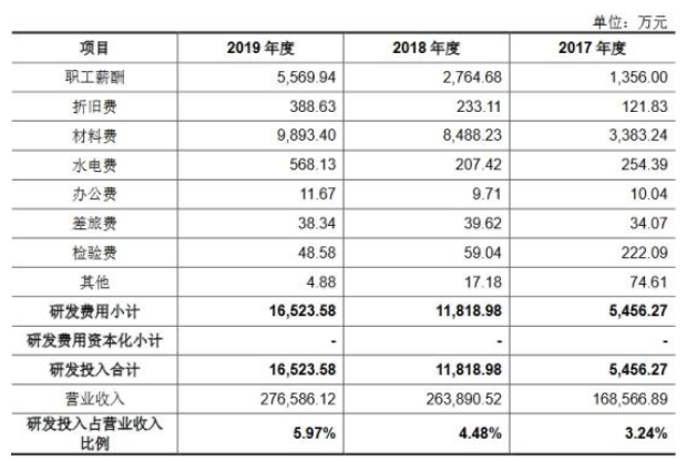 2017年至2019年,該公司研發(fā)人員薪酬分別為1356.00萬元、2764.68萬元和5569.94萬元,占研發(fā)費(fèi)用的比例分別為24.85%、23.39%和33.71%;材料費(fèi)分別為3383.24萬元、8488.23萬元和9893.40萬元,占研發(fā)費(fèi)用的比例分別為62.01%、71.82%和59.87%。