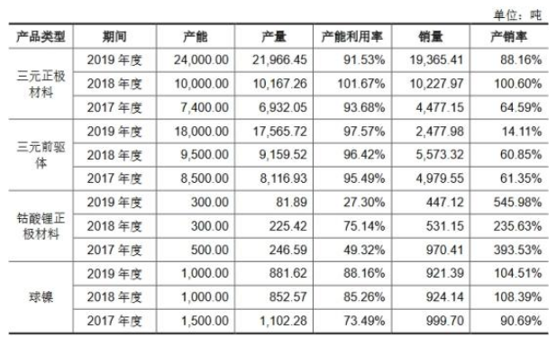 2018年,長遠(yuǎn)鋰科的三元正極材料產(chǎn)銷率還維持在100.60%。但在2019年,該公司三元正極材料大幅擴(kuò)產(chǎn)后,其產(chǎn)銷率僅有88.16%,產(chǎn)能利用率亦從2018年的101.67%下滑至91.53%。