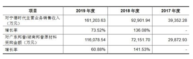 前述可知,寧德時(shí)代及其下屬企業(yè)同時(shí)還是長遠(yuǎn)鋰科的第一大客戶。2018年和2019年,長遠(yuǎn)鋰科對寧德時(shí)代主營業(yè)務(wù)銷售收入增長率分別為136.08%和73.52%;對廣東邦普/湖南邦普原材料采購金額增長率分別為141.53%和60.88%