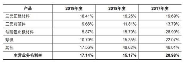 2017年至2019年,三元正極材料毛利率分別為19.69%、16.25%和18.41%;三元前驅(qū)體毛利率分別為13.79%、11.81%和9.66%;鈷酸鋰正極材料鈷酸鋰正極材料28.90%、15.79%和5.87%;球鎳毛利率分別為22.07%、15.35%和10.70%;其他產(chǎn)品毛利率分別為46.01%、48.62%和17.56%。