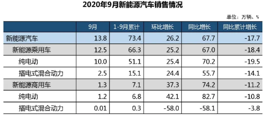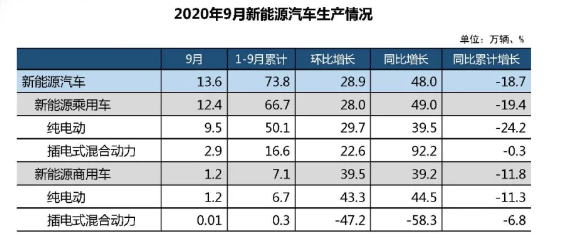 1-9月份新能源車累計生產(chǎn)73.8萬,銷售73.4萬,同比累計增長率在-18.7%和17.7%。