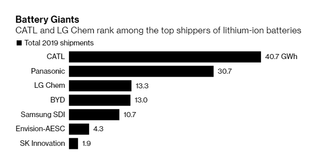 寧德時代和LG化學是鋰離子電池的主要供應商之一。(圖片來源:彭博社)