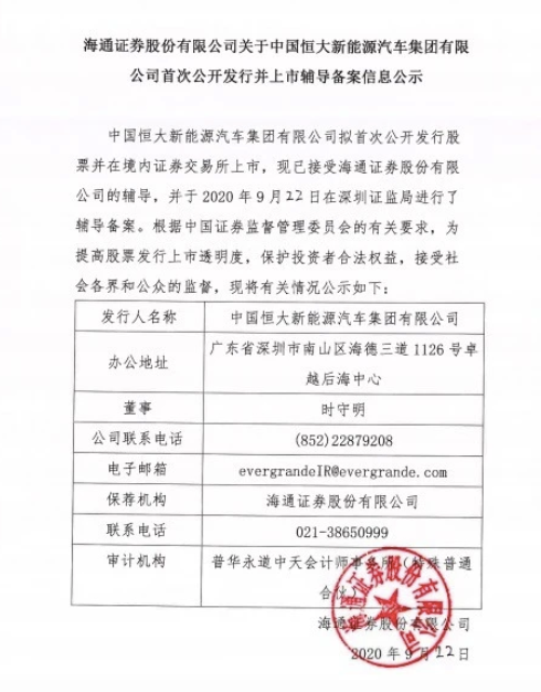根據(jù)公示,恒大新能源汽車(chē)擬首次公開(kāi)發(fā)行股票并在境內(nèi)證券交易所上市,現(xiàn)已接受海通證券輔導(dǎo),并于9月22日在深圳證監(jiān)局進(jìn)行了輔導(dǎo)備案。