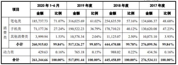 業(yè)績(jī)方面,據(jù)招股書披露,2017年、2018年、2019年和2020年1-6月,珠海冠宇營(yíng)業(yè)收入分別為293,505.67萬(wàn)元、474,695.09萬(wàn)元、533,105.08萬(wàn)元和269,615.88萬(wàn)元,其中主營(yíng)業(yè)務(wù)收入全部為核心技術(shù)產(chǎn)品收入。