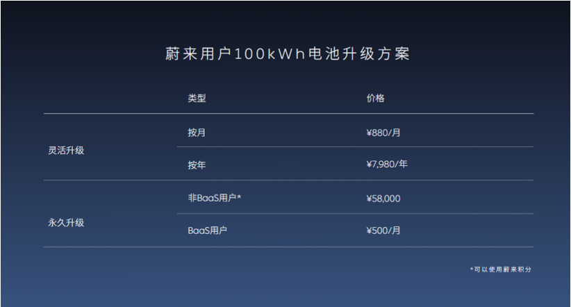 據(jù)悉,此次升級電池包方案對84kWh電池包的用戶給予了更大優(yōu)惠,即非BaaS用戶84kWh永久升級100kWh費用為5400元,支持蔚來積分支付。而70kWh電池包用戶可以根據(jù)買斷永久升級、BaaS永久升級、靈活升級這三種選擇升級,費用也有所區(qū)別。