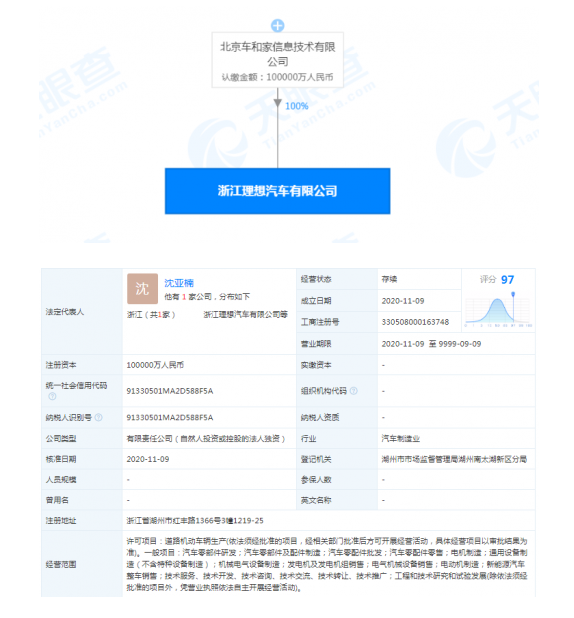 天眼查顯示,11月9日,浙江理想汽車有限公司成立,注冊(cè)資本為10億元人民幣,法定代表人為沈亞楠,由北京車和家信息技術(shù)有限公司全資持股。經(jīng)營(yíng)范圍包括汽車零部件研發(fā)、汽車零部件及配件制造、汽車零配件批發(fā)、汽車零配件零售、電機(jī)制造、新能源汽車整車銷售等。