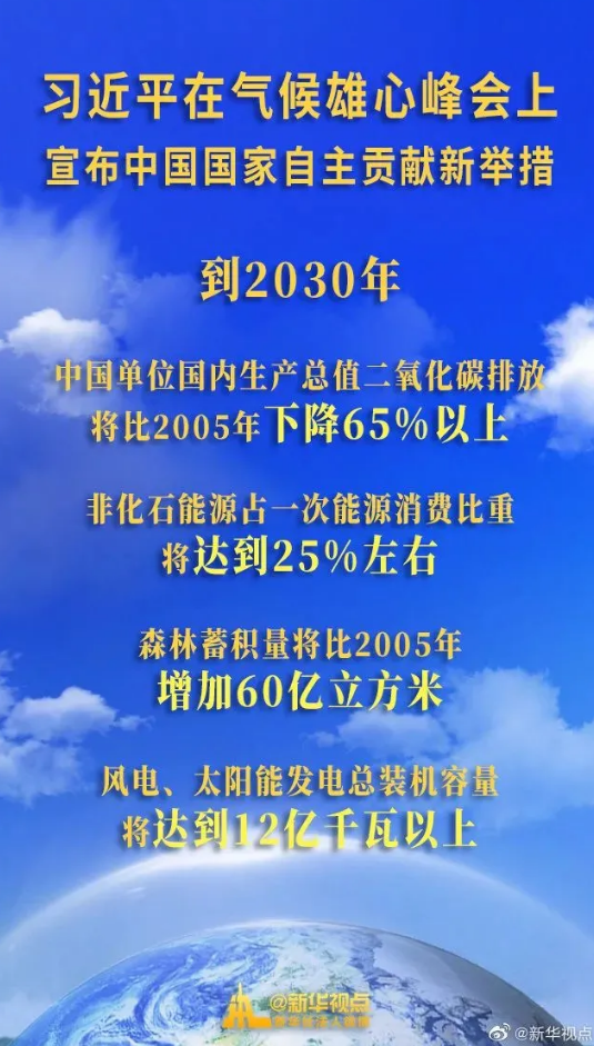 在9月宣布2030年前二氧化碳排放達(dá)到峰值,努力爭(zhēng)取2060年前實(shí)現(xiàn)碳中和基礎(chǔ)上,進(jìn)一步宣布:到2030年,中國(guó)單位國(guó)內(nèi)生產(chǎn)總值二氧化碳排放將比2005年下降65%以上,非化石能源占一次能源消費(fèi)比重將達(dá)到25%左右,森林蓄積量將比2005年增加60億立方米,風(fēng)電、太陽(yáng)能發(fā)電總裝機(jī)容量將達(dá)到12億千瓦以上。