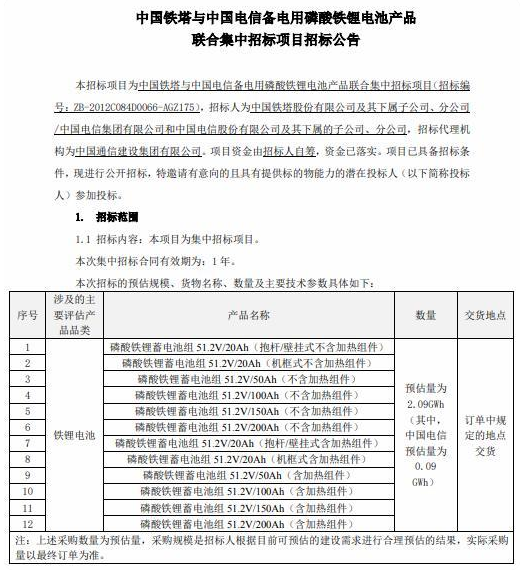 公告顯示,本次招標預估量為2.09GWh,其中,中國鐵塔的招標預估量達到2GWh,中國電信的招標預估量為0.09GWh,交貨地點為訂單中規(guī)定的地點交貨。