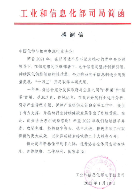 2022年1月21日,中國化學(xué)與物理電源行業(yè)協(xié)會秘書處收到工業(yè)和信息化部電子信息司發(fā)來的感謝信,對協(xié)會在2021年為工業(yè)和信息化部電子信息司開展的行業(yè)運行分析、引導(dǎo)產(chǎn)業(yè)轉(zhuǎn)型升級、保障產(chǎn)業(yè)鏈供應(yīng)鏈穩(wěn)定等工作中所提供的有力支撐表示感謝,并肯定了協(xié)會在發(fā)揮政府和企業(yè)之間的“橋梁”和“紐帶”作用。
