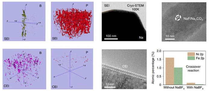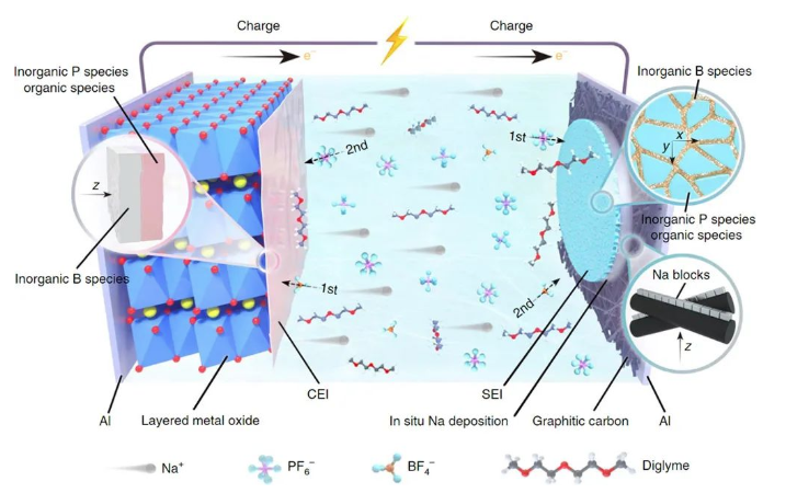 實現(xiàn)該類電池高比能與長循環(huán)壽命的關(guān)鍵在于正極、集流體與電解液側(cè)的綜合性設(shè)計。在正極側(cè),該研究選取了不含鈷的銅基O3相層狀氧化物,保證電池高能量密度的同時具有低成本和可持續(xù)性。為了實現(xiàn)自下而上較為平滑的金屬鈉沉積,在負(fù)極集流體側(cè)選用石墨化碳涂層使鈉離子具有較低的形核過電勢,控制金屬鈉以較小尺寸均勻密集形核。然而,研究發(fā)現(xiàn)即使用該親鈉型集流體涂層,傳統(tǒng)的醚類電解液中沉積的金屬鈉表面依然存在裂紋,裂紋會不斷與電解液發(fā)生反應(yīng)消耗活性金屬鈉,并導(dǎo)致后續(xù)循環(huán)中不均勻的鈉沉積甚至鈉枝晶形成。為了進(jìn)一步解決上述界面破裂問題,該研究設(shè)計了一款含硼鹽的電解液,利用多尺度的界面表征技術(shù)捕捉到其分解產(chǎn)物在負(fù)極(SEI)及正極(CEI)界面處均形成了非晶態(tài)固體電解質(zhì)中間相,并且硼-氧組分在負(fù)極側(cè)界面膜的外層呈現(xiàn)二維分布,而在正極側(cè)界面膜的內(nèi)層呈現(xiàn)三維分布。基于量子化學(xué)/分子動力學(xué)模擬發(fā)現(xiàn)添加了硼鹽后的電解液具有特殊的溶劑化構(gòu)型進(jìn)而影響在正負(fù)極側(cè)的分解順序,合理地解釋了這種含硼組分在正負(fù)極側(cè)異質(zhì)分布的奇異現(xiàn)象。堅固且柔性的SEI膜有效地抑制了死鈉及鈉枝晶的形成,修復(fù)了金屬鈉沉積和剝離過程中形成的裂紋,而超薄的CEI膜則保護(hù)了正極的結(jié)構(gòu)完整性并阻礙過渡金屬離子溶解。