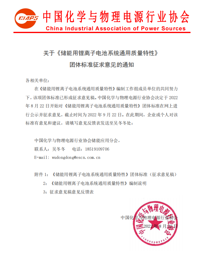 各相關(guān)單位:在《儲能用鋰離子電池系統(tǒng)通用質(zhì)量特性》編制工作組成員單位的共同努力下,該項團(tuán)體標(biāo)準(zhǔn)已形成征求意見稿。中國化學(xué)與物理電源行業(yè)協(xié)會決定于2022年8月22日開始對《儲能用鋰離子電池系統(tǒng)通用質(zhì)量特性》團(tuán)體標(biāo)準(zhǔn)在網(wǎng)上進(jìn)行公示并征求意見,截止時間為2022年9月22日。在此期間,企業(yè)或個人對該標(biāo)準(zhǔn)有意見和建議,請?zhí)顚懸庖姺答伇戆l(fā)送至吳冬冬處: