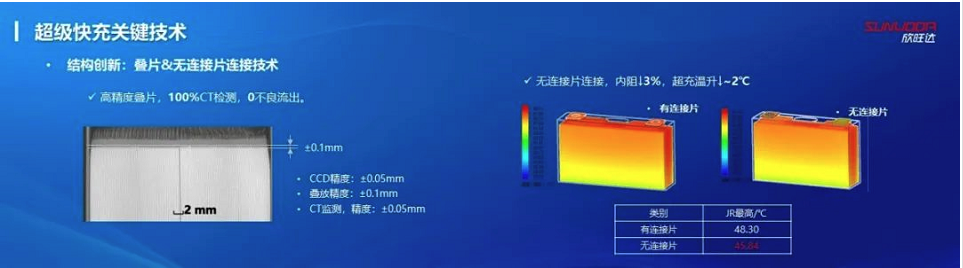 結構創(chuàng)新上,使用疊片&無連接片連接技術加持,卷芯100%CT檢測,0不良流出,電芯內阻下降3%,超充溫升下降~2℃。同時,系統實現了3D液冷技術,達到更高的加熱和散熱效率,同時也降低成本、實現更高集成度。上述多重創(chuàng)新技術疊加,使得欣旺達超快充動力電池SFC480能做到-20℃的低溫下能量保持率高于85%,低溫性能極佳;特殊的材料及CTP3.0結構設計,體積利用率大于72%;且可做到無熱擴散。