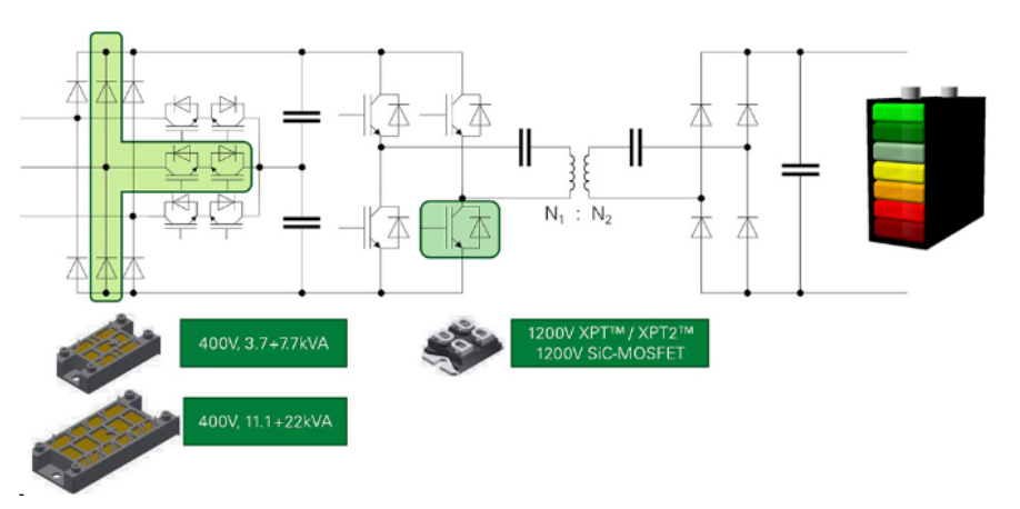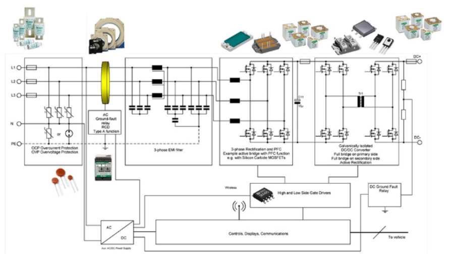 通常來說,充電器采用模塊化方法從可以堆積輸出功率的子系統(tǒng)中構建。大多數(shù)標準設計每個子系統(tǒng)的功率為15-60 kW,元件的選擇因功率輸出需求和冷卻偏好而不同。雖然10kW至15kW的強制空氣冷卻機組廣泛采用離散設備,但更高功率機組使用液體冷卻,主要由多個功率模塊構成。