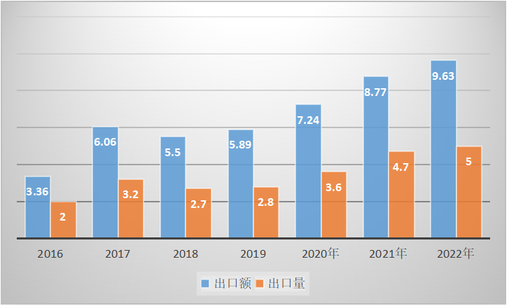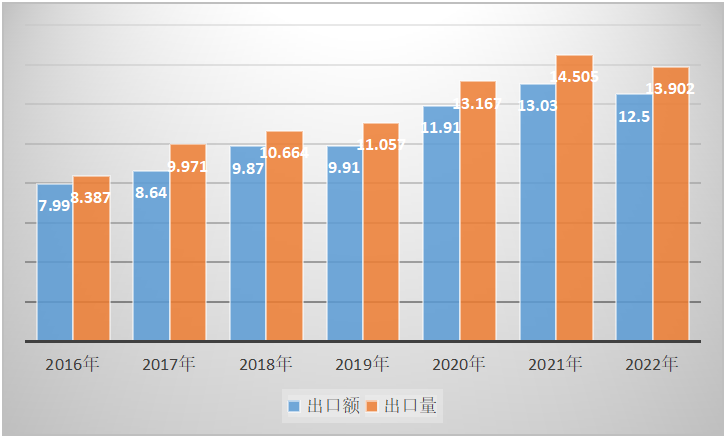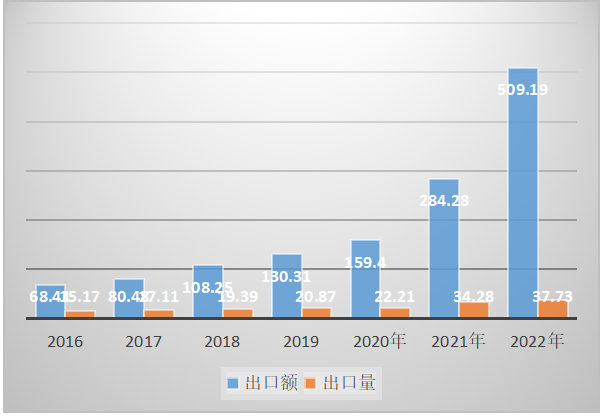 根據(jù)海關(guān)出口數(shù)據(jù)統(tǒng)計(jì)分析,近6年來(lái),鋰離子電池產(chǎn)品一直是中國(guó)電池出口的主要品種,出口額占比均超過(guò)50%,并呈逐年快速遞增。從2016年的出口額68.41億美元,占比56.67%,快速上升2022年的出口額509.19億美元,占比88.1%;出口數(shù)量從2016年的15.17億只增長(zhǎng)到2022年的37.73億只。