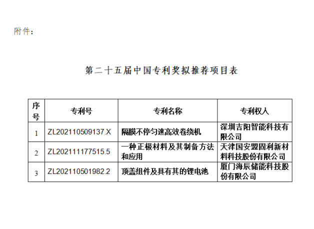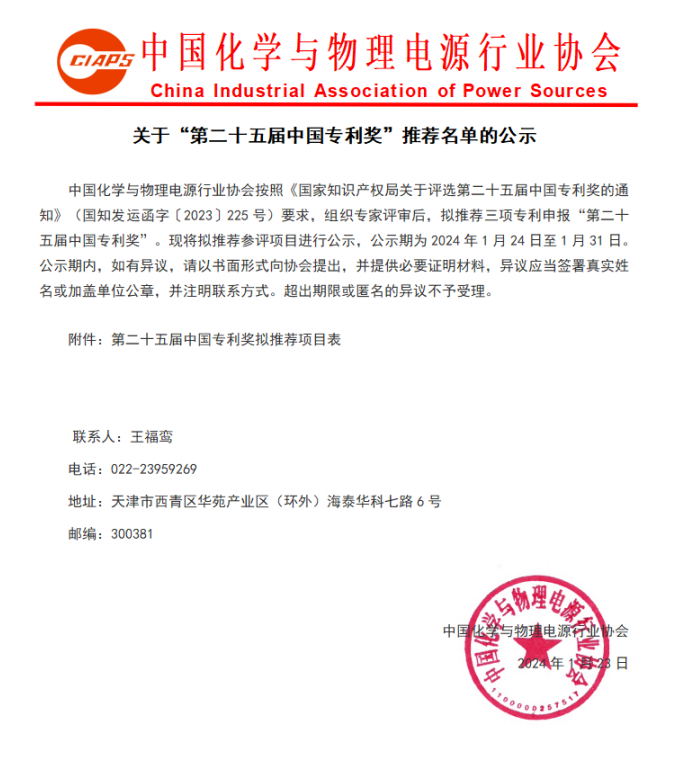 中國化學(xué)與物理電源行業(yè)協(xié)會按照《國家知識產(chǎn)權(quán)局關(guān)于評選第二十五屆中國專利獎的通知》(國知發(fā)運(yùn)函字〔2023〕225號)要求,協(xié)會組織專家評審,擬推薦三項(xiàng)專利申報(bào)“第二十五屆中國專利獎”?,F(xiàn)將擬推薦參評項(xiàng)目進(jìn)行公示,公示期為2024年1月24日至1月31日。公示期內(nèi),如有異議,請以書面形式向協(xié)會提出,并提供必要證明材料,異議應(yīng)當(dāng)簽署真實(shí)姓名或加蓋單位公章,并注明聯(lián)系方式。超出期限或匿名的異議不予受理。