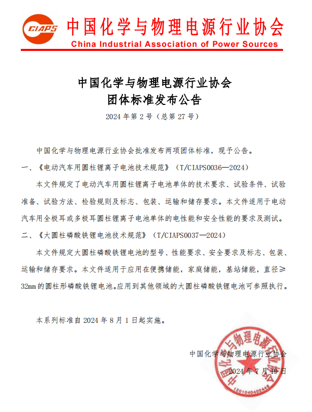一、《電動(dòng)汽車用圓柱鋰離子電池技術(shù)規(guī)范》(T/CIAPS0036—2024)
