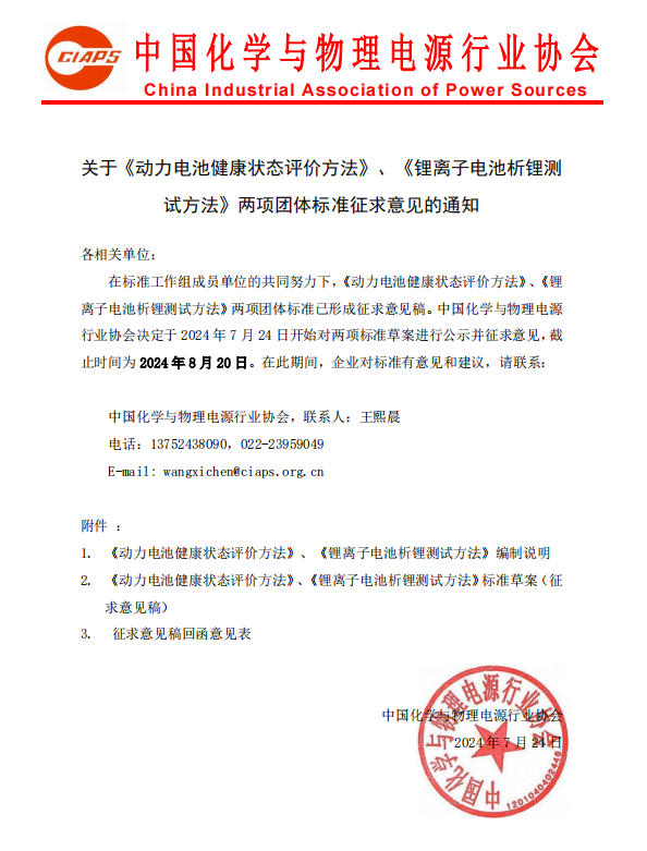 在標準工作組成員單位的共同努力下,《動力電池健康狀態(tài)評價方法》、《鋰離子電池析鋰測試方法》兩項團體標準已形成征求意見稿。中國化學與物理電源行業(yè)協(xié)會決定于2024年7月24日開始對兩項標準草案進行公示并征求意見,截止時間為2024年8月20日。在此期間,企業(yè)對標準有意見和建議,請聯(lián)系: