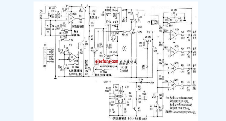 電路原理見圖所示。該電路由以U5為核心組成的蓄電池過充電控制電路、以 U 4A ~U4D為核心組成的蓄電池電壓指示電路及顯示電壓按鈕開關(guān) KS1 電路、以 U1B 組成的蓄電池過放電控制電路、以 U1A組成的開燈檢測控制電路、以 U2 組成的開燈及延時熄燈及二次開燈定時控制電路,以及以控制三極管Q2驅(qū)動繼電器組成的輸出控制電路等組成?,F(xiàn)分別介紹如下。