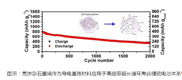 該電池正極的含硫量可高達(dá)60%,在循環(huán)過程中具備優(yōu)異的庫(kù)侖效率(約為97%),即便是經(jīng)過2000次循環(huán)以后,其所呈現(xiàn)的比容量仍可比擬現(xiàn)今最好的鋰離子電池。經(jīng)過X射線吸收光譜與第一性原理模擬分析,該材料優(yōu)異的性能歸功于氮摻雜石墨烯片層中N功能基團(tuán)對(duì)多硫化鋰優(yōu)異的吸附性,該研究結(jié)果也證實(shí)基于S@NG復(fù)合材料的鋰硫電池具備巨大的潛力可替代現(xiàn)有鋰離子電池應(yīng)用于便攜式電子、新型動(dòng)力能源等儲(chǔ)能領(lǐng)域。