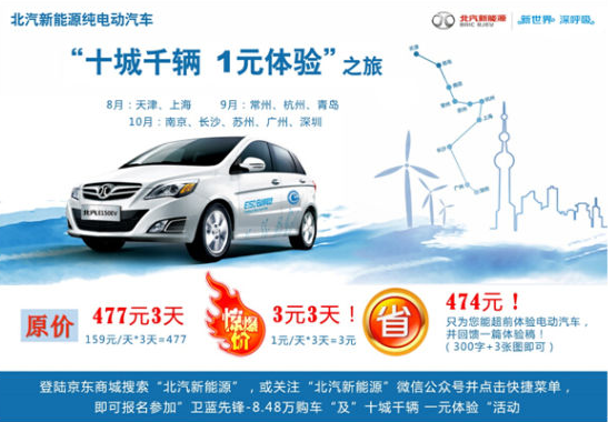 另悉,8月16日,北汽新能源又開啟“十城千輛 一元體驗”的純電動汽車深度體驗活動,計劃從8月至春節(jié)前,在天津、青島、南京、常州、蘇州、杭州、上海、長沙、廣州、深圳等全國十個新能源汽車重點推廣城市投放近千輛E150EV,讓消費者僅需1元即可享有1天、最長3天的體驗機會。預(yù)計整個活動共將釋放25200個“3元3天”的深度體驗包,直接體驗總計75600天次,間接影響近30萬人次,將創(chuàng)下全球最大規(guī)模的電動汽車體驗“吉尼斯”。這也是北汽新能源正式走出北京、啟動全國市場的開始。