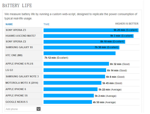 讓人欣慰的是華為Mate 7也拿到了9小時的優(yōu)良成績,不過它采用了一塊4100mAh電池,屏幕尺寸也達到了6英寸。相比5.2英寸索尼Xperia Z3的3100mAh電池,7.3毫米的厚度。顯然Z3的成績要更為難得。