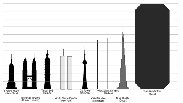 特斯拉在內(nèi)華達的超級電池工廠即將開工,那么這個工廠到底有多大?最近有好事的美國人就做了一張圖,這樣看起來,這個工廠還確實挺大的。當(dāng)然,下面這圖上的特斯拉工廠,并不是在表示自己的高度。而是做圖的兄弟,將這座工廠給豎了起來??梢钥吹剑绻悄壳笆澜缟献罡叩?29.8米的迪拜哈里法塔,將它橫放在特斯拉的工廠里,它還差270才能抵到工廠的另一頭。