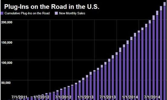 從以上圖表可見,自2010年12月以來,美國市場中插電式混合動(dòng)力汽車的銷量成指數(shù)不斷倍增。