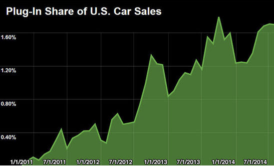 以上圖表顯示了插電式混合動(dòng)力汽車在美國汽車銷量中的占比。