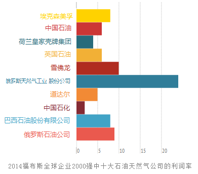 耐人尋味的是,十大石油天然氣公司的利潤率差異很大。俄羅斯天然氣工業(yè)股份公司(Gazprom)以24%的利潤率遙遙領(lǐng)先,盡管烏克蘭局勢持續(xù)動蕩以及歐洲市場上出現(xiàn)來自頁巖氣的競爭。由于中國政府現(xiàn)在正在改革國有企業(yè)的結(jié)構(gòu),并且允許市場發(fā)揮更大的作用,中國國有企業(yè)中石化的利潤率最低(2%)。