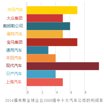 與十大銀行和十大制藥公司的出色表現(xiàn)相比,十大汽車公司的平均利潤率只有6%。在十大汽車公司當中,通用汽車(General Motors)的利潤率最低(3%),盡管市場對該公司新任首席執(zhí)行官瑪麗·巴拉(Mary Barra)的復(fù)興計劃寄予厚望。另一家美國汽車制造商——福特汽車的利潤率與其國際競爭對手相比也相對較低(5%)。利潤率最高的是韓國的現(xiàn)代汽車(10%),今年該公司在榜單中的排名提升兩位至第87。