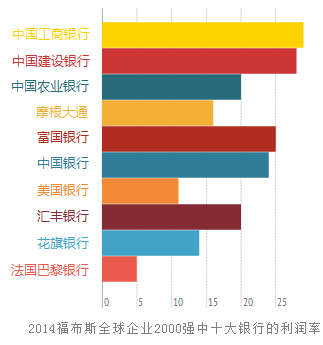 全球十大銀行去年盈利表現(xiàn)也不錯,平均利潤率為19%。連續(xù)第二年榮登福布斯全球企業(yè)2000強榜首的中國工商銀行以29%的利潤率摘得最賺錢銀行的桂冠。法國最大的銀行——法國巴黎銀行(BNP Paribas,利潤率為5.2%)以很大差距落后于全球十大銀行中的其他銀行,由于美國監(jiān)管機構(gòu)對該銀行參與的可能會受到美國制裁的交易進行調(diào)查,該銀行撥出了11億美元準備金。