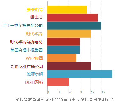 今年,在福布斯全球企業(yè)2000強的十大媒體公司中,美國擁有九家公司。媒體巨頭維亞康姆(Viacom)盡管在全球企業(yè)2000強榜單中只是第九大媒體公司,但由于電視收視率攀升而取得了18%的利潤率。二十一世紀??怂构荆═wenty-First Century Fox)以15%的利潤率在十大媒體公司中排名第二,這要歸功于其從前出版機構(gòu)新聞集團(News Corp)分拆出來。