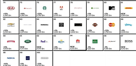 前100名中首次出現(xiàn)了中國(guó)品牌——華為。公司位列94名。華為的安卓智能手機(jī)以低廉的價(jià)格為消費(fèi)者所熟知。Interbrand稱(chēng),華為正設(shè)法擺脫價(jià)格低廉的形象,逐步在公眾眼中構(gòu)建高檔品牌的新形象。