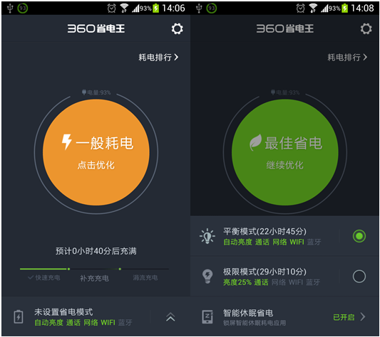 未來技術(shù)中的省電電池我們目前還無法用到,但一些方法仍然觸手可及。據(jù)了解,使用360省電王軟件可平均為每部手機(jī)待機(jī)時(shí)間多延長一天。其具 備的智能休眠省電技術(shù)、專屬云省電方案、夜間智能省電模式以及最全耗電排行榜,可讓手機(jī)用戶清晰掌控手機(jī)電量被耗費(fèi)的每個(gè)源頭,并找到最佳省電方案,以大 家最常用的三星手機(jī)為例,在使用360省電王的專屬省電方案后,平均每部三星手機(jī)的待機(jī)時(shí)間延長了24.2個(gè)小時(shí)!相當(dāng)于可以多待機(jī)一天。據(jù)透露,未 來,360省電王還會(huì)加入智能CPU控制的省電措施。