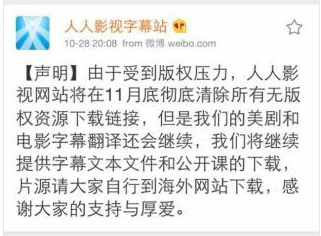10月29日中午消息,昨日晚間,人人影視字幕站官方微博發(fā)布聲明稱,由于受到版權(quán)壓力,將于11月底徹底清除所有無版權(quán)資源的下載鏈接,隨后這一微博很快被刪除。
